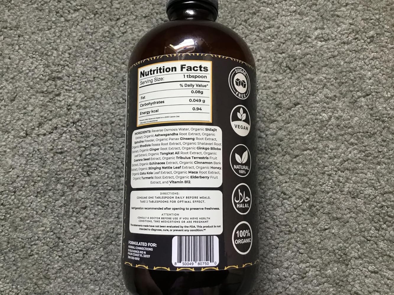 This tonic is contained within a dark-colored, 16 oz. glass bottle, which makes me so happy. The dark coloring appropriately protects the liquid inside from sustaining light-induced damage, and the glass material does not pose the same contamination concerns as an irredeemable material like plastic would. The bottle’s lid is typically easy for me to open with my weak, painful hands, but it arrived screwed shut very tightly, making it a painful struggle for me to open initially. Once my hands had become red and raw, I actually gave up and had to wait for my husband to get home so that he could open it for me. At least it didn’t arrive leaky, I guess. No dropper tube or measuring cup is included, but the dosage is listed in tablespoons, so if you’ve got one of those, you’re good to go. Per the label’s instructions, one tablespoon of this tonic should be taken daily before meals, but 2 tablespoons can be taken for optimal effect.Examining the bottle’s labeling, I see quality-related boasts that this product is sugar-free, vegan, 100% natural, Halal, and 100% organic. Specifically, I see listed that it’s “made with pure, natural ingredients and no artificial additives, preservatives, or fillers.” I don’t see any indication as to where it was made or from where its ingredients were sourced, but I do see that it was formulated for a Florida-based company whose full address and phone number are indicated. Comparing the listed Nutrition Facts and Ingredients to those shown in the product images, I see that they match exactly. Something that I noticed and loved about how these are displayed in the product images that holds true on the product’s labeling itself is that the ingredients, which are necessarily very detailed, have the main word of each ingredient bolded so that it’s much easier to skim the list to get an idea of what’s basically included. I’m super impressed with this idea, which I think should be an industry standard. I also love the collection of ingredients featured in this blend and especially that the water used is Reverse Osmosis Water. A note Included with the bottle states in both English and Spanish that this product should be refrigerated after opening, that you should shake it well before each use, and that if the flavor is too strong or bitter, it dilutes well into juice or a smoothie for a more palatable experience.The liquid itself tastes like a vibrant chai tea, just as another reviewer mentioned. It’s slightly sweet, and I didn’t find it to be unpalatably bitter (noting that I rarely sweeten my tea or coffee). I actually think it’s incredibly delicious, and there’s no way I’d want to mask the flavor.Overall, this is what I consider a premium product, and I highly recommend it.